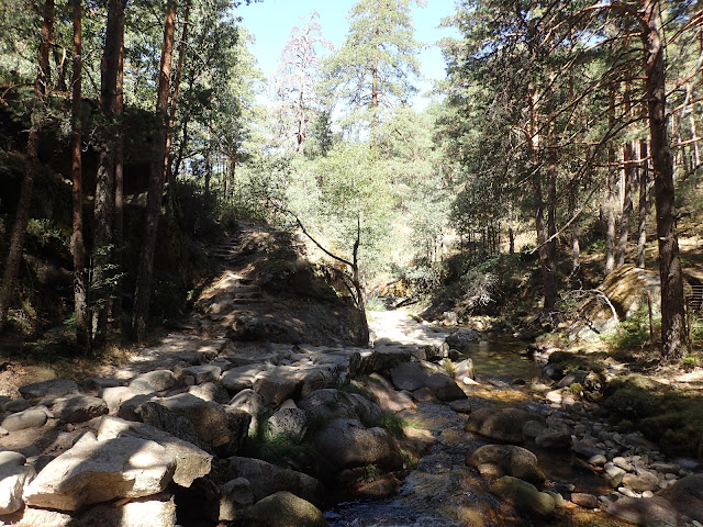 Después de un buen chapuzón, retomo la senda, que me llevara hacia el río Eresma. Donde tomaré la Senda de las Pesquerías Reales hasta Valsaín. Veo los restos de lo que fue esta Senda. Hay grandes lajas de piedra por la margen izquierda. La cuales ayudaban al rey, en su afición a la pesca de la trucha. Hoy en día es un bello paseo.