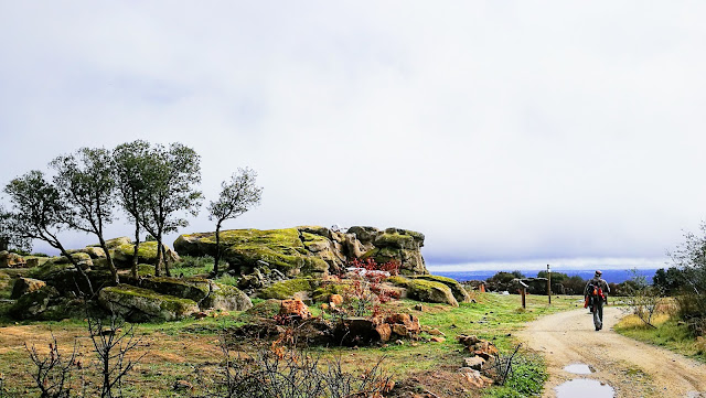 En un pequeño altillo a la izquierda me subo y tengo una bonita vista de la Peña de Cadalso de los Vidrios. Ahora la niebla nos ha dado una pequeña tregua y de vez en cuando nos llegan los rayos de sol que se agradecen.