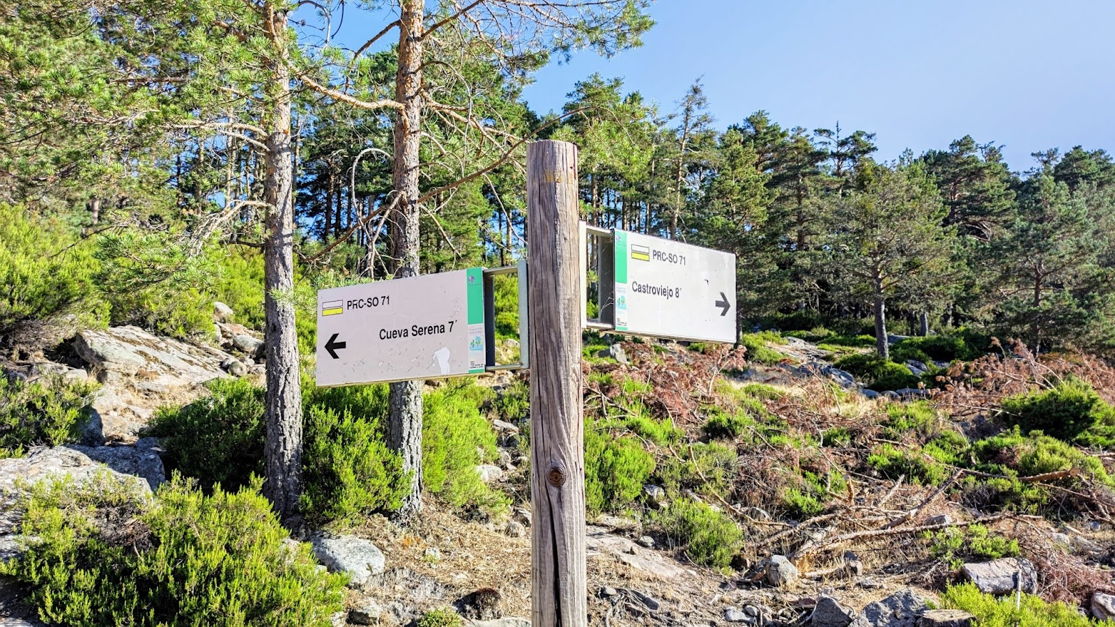 Algo más arriba vamos a encontrarnos por la izquierda con el camino por el que volveremos. Nosotros vamos a continuar subiendo de frente. Hay que estar atentos porque un poco más arriba vamos a abandonar la compañía del Sendero PR-SO 71 por la izquierda. La vamos a acortar un poco ya que lo que queda hasta el Raso de la Cespedilla no nos pareció interesante, por eso en la ruta lo hemos recortado en este punto. Si subes hasta dicho punto, lo que verás será un enlace con otro sendero y el final de una pista forestal que es por donde el Sendero Oficial sube y no me parece a mi gusto buena idea subir por ella. Ya que hasta vimos coches subiendo algo rápidos por ella, con lo que te envolverían en la polvareda.