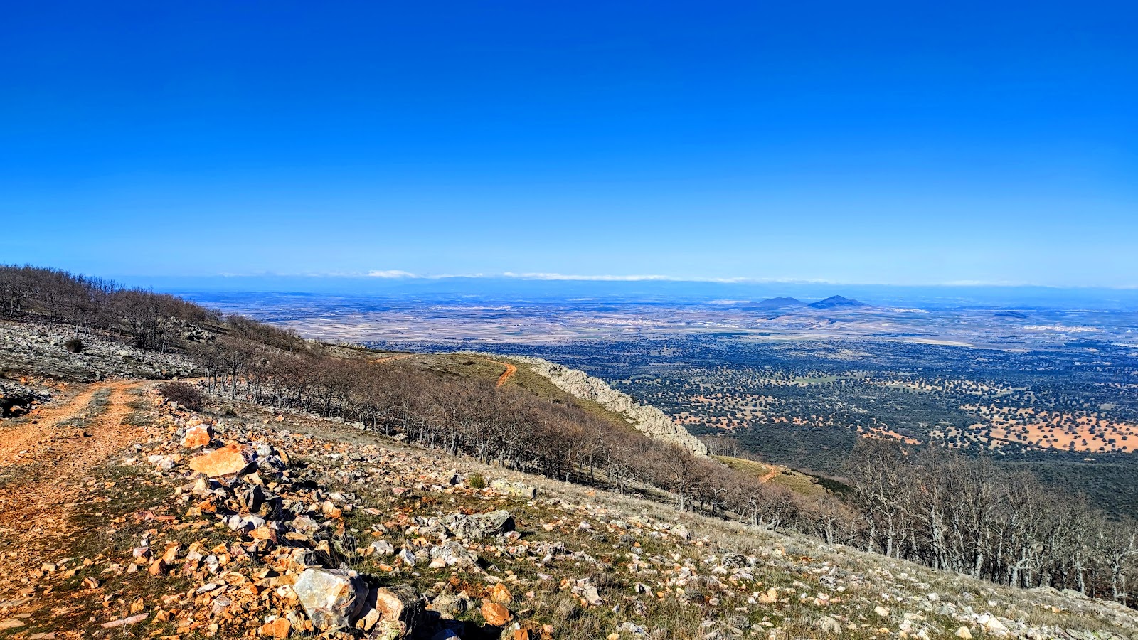 Desde aquí tenemos unas amplias vistas de los Montes de Toledo. Hacia el Este realice la ruta de Los Riscos de los Yebenes y al Oeste se encuentra la Sierra de San Pablo (Las Majadillas Pico Vicente Pico Peñafiel) y el Techo de Toledo El Rocigalgo.